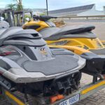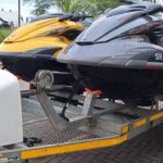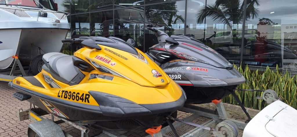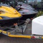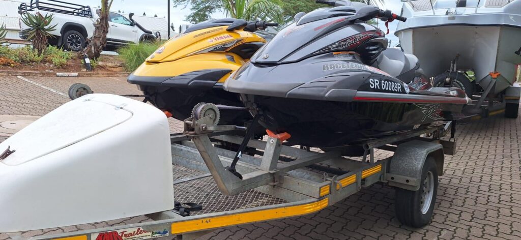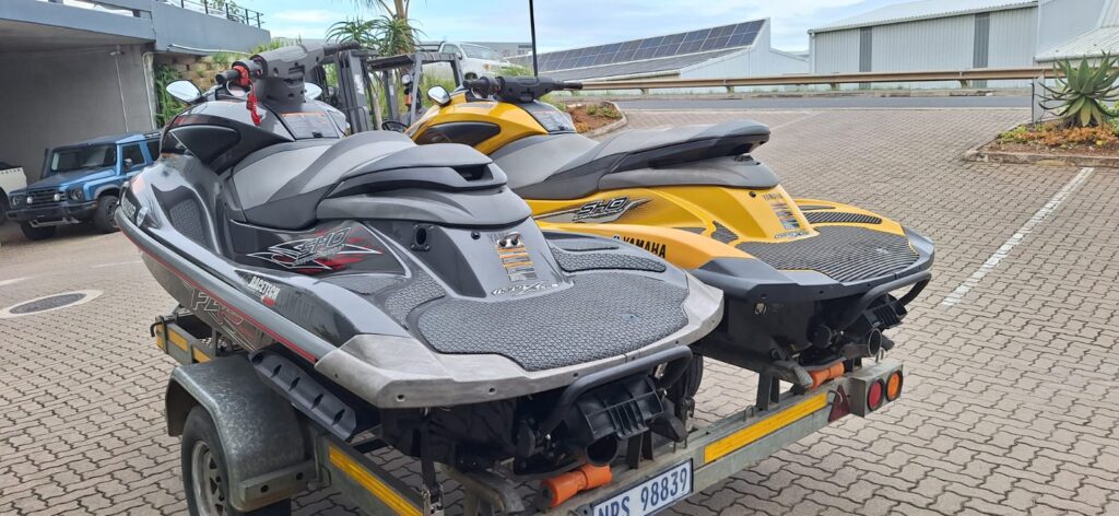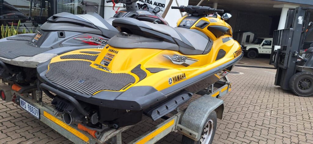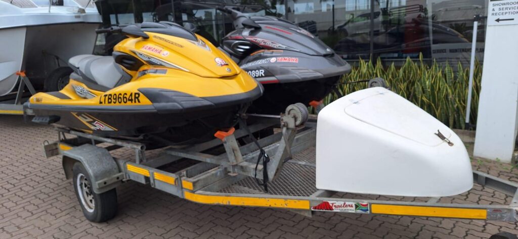 2x Yamaha JetSkis on a double RMR Trailer with nose cone. 2013 Yamaha FZS 1800 SHO Yellow 57hrs 2012 Yamaha FZR 1800 SHO Grey 96 hrs